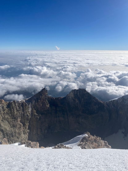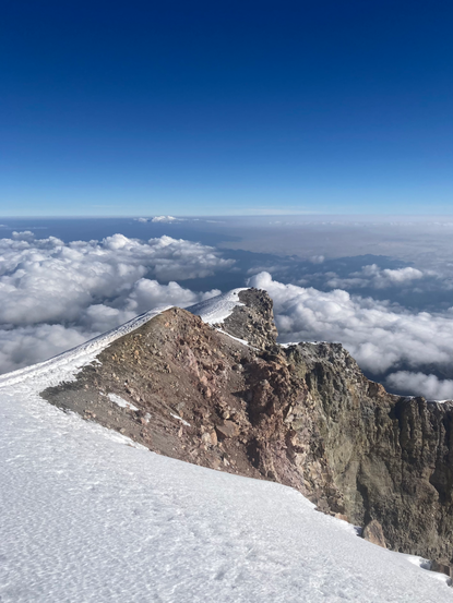 Yo tome la responsabilidad de una cordada de 2 personas, algo que nunca había hecho en la vida y fue una experiencia de responsabilidad interesante que disfrute pero fue cansado. Subiendo el glaciar iba marcando un ritmo pero las personas de mi cordada iban ligeramente más lento entonces sentía tensión en la cuerda mientras íbamos subiendo. Esta tensión volvió un poco más física la subida de la montaña pues iba jalando ligeramente al grupo para llegar a la cumbre. Fue una experiencia de mucha paciencia en la que tuve que tomar el ritmo más lento de la persona del grupo e impulsarlos durante más de la mitad del glaciar. En la otra cordada venía Gama como guía con Bernardo y Efraín, era una cordada muy fuerte que pudieron haber subido muy rápido pero por seguridad estuvieron esperandonos para mantener al grupo junto.
